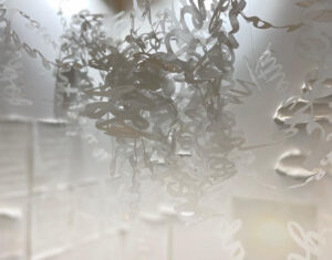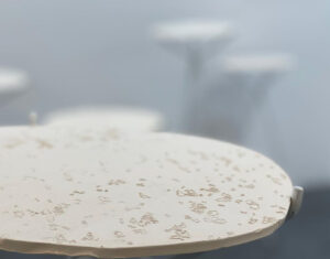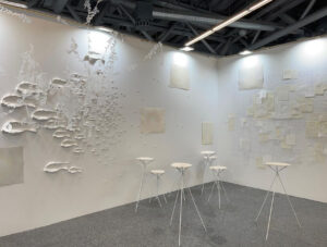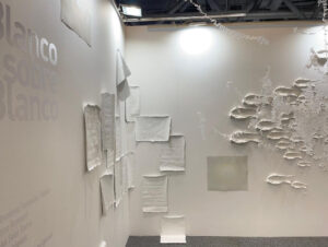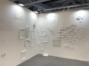 On the other hand of the project, we have the exhibition Blanco sobre blanco [white on white] a co-curated collective show presented site-specific for the FIG International Print Fair in Bilbao in 2023. For this exhibition, that was taking place along with the presentation of the artist-book, a selection of six artists and researchers, members of the dx5, created a new installation. Working in different disciplines, graphic works where proposed from tridimensional ceramics structures, laser-cutted polyester ethereal hanging installations, tradicional woodcutting engravings, expanded 3D printed paints and acrylic materials and silkscreened post-its subjectives maps. Every artist (Ana Soler, Anne Heyvaert, Almudena Fernández Fariña, Antía Iglesias, Carlos Fer and Jose Andrés Santiago Iglesias) addressed at least one of the five main themes selected as ‘fundamental’ for graphic creation and experimented with it on their own practices.