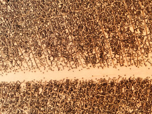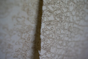 Using the scanned image and following specific guidelines, a digital matrix—an intangible template—was created. This image is then interpreted and modified (without manual intervention) by the software of a laser-cutting machine. During the cutting process, diverse pathways, both invented and imaginary, emerge: intermediate states that ultimately lead to a tactile woodcut matrix.