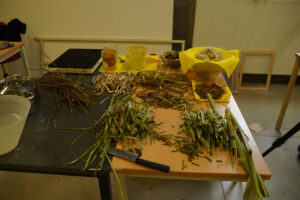 The material exploration allow to test paper possibilities, ink extraction and lake pigment precipitation processes with Fallopia japonica raw matter.
